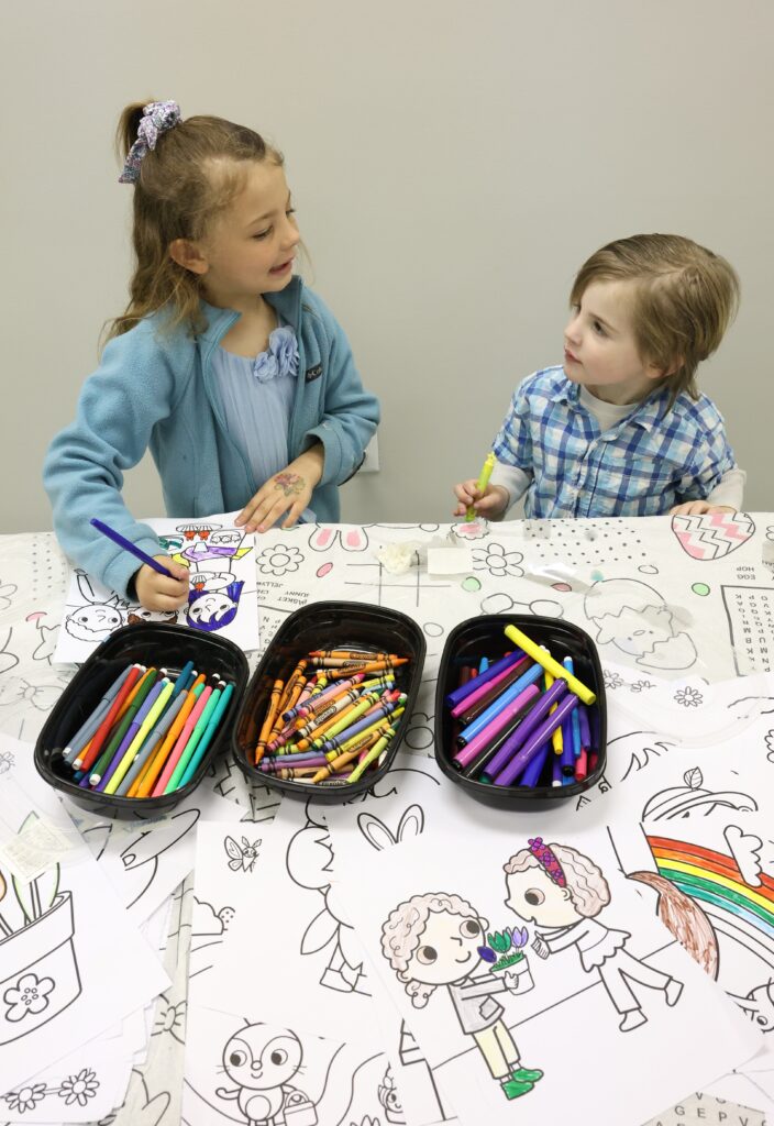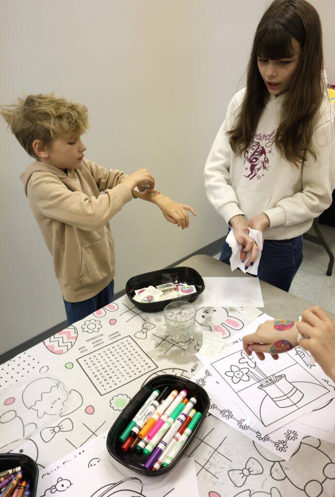 Adding to the fun, there was a raffle with prizes for lucky winners, and a coloring table where kids could take a break, get creative, and show off their masterpieces. Between egg hunts, token trades, tattoos, bunny cuddles, raffle excitement, and coloring creativity, the morning was packed with activity and Easter magic.