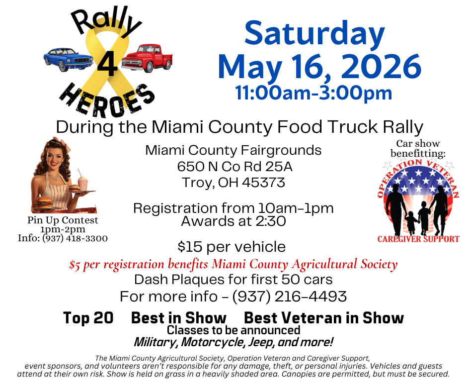 Operation Veteran and Caregiver Support is honored to be hosting the 2026 Rally 4 Heroes Car Show, happening Saturday, May 16, 2026, during the Miami County Food Truck Rally & Competition at the Miami County Fairgrounds in Troy.